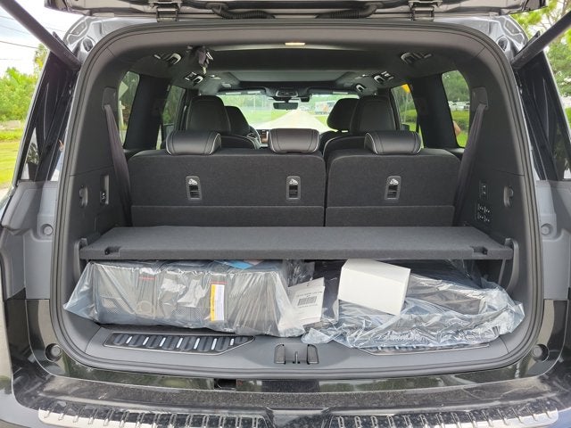 Mineral Black/Graphite Shadow 2025 INFINITI QX80 AUTOGRAPH 3rd row seats: bench, 4-Wheel Disc Brakes, ABS brakes, Adaptive suspension, Air Conditioning, Alloy wheels, AM/FM radio: SiriusXM with 360L, Anti-whiplash front head restraints, Apple CarPlay/Android Auto, Audio memory, Auto High-beam Headlights, Auto tilt-away steering wheel, Auto-dimming door mirrors, Auto-dimming Rear-View mirror, Auto-leveling suspension, AUTOGRAPH Exterior Package, Automatic temperature control, Black Interior Lighting Package, Brake assist, Bumpers: body-color, Cargo Blocks, Center Front Spoiler, Climate Controlled Front Bucket Seats w/Massage, Compass, Console Net, Dark Matte Rear Bumper Protector, Delay-off headlights, Driver door bin, Driver vanity mirror, Dual front impact airbags, Dual front side impact airbags, Electronic Stability Control, Emergency communication system: INFINITI InTouch, Four wheel independent suspension, Front anti-roll bar, Front Bucket Seats, Front Center Armrest, Front dual zone A/C, Front reading lights, Fully automatic headlights, Garage door transmitter: myQ Connected Garage, Genuine wood dashboard insert, Genuine wood door panel insert, Heads-Up Display, Heated door mirrors, Heated front seats, Heated rear seats, Heated steering wheel, HVAC memory, Illuminated entry, INFINITI Radiant Black Cargo Scuff Plates, Knee airbag, Leather steering wheel, Literature Kit, Low tire pressure warning, Memory seat, Navigation system: Google Built-in, Occupant sensing airbag, Outside temperature display, Overhead airbag, Overhead console, Panic alarm, Panoramic Illuminated Headliner, Passenger door bin, Passenger vanity mirror, Power door mirrors, Power driver seat, Power Liftgate, Power moonroof, Power passenger seat, Power steering, Power windows, Premium Cargo Package, Premium Paint, Radio data system, Radio: Klipsch Reference Premiere Audio System, Rain sensing wipers, Rear air conditioning, Rear anti-roll bar, Rear reading lights, Rear seat center armrest, Rear window defroster, Rear window wiper, Reclining 3rd row seat, Remote keyless entry, Reversible Cargo Mat, Security system, Semi-Aniline Premium Leather Seating Surfaces, Silver Cross Bars, Smart Luggage Shelf, Soft Sided Cooler, Speed control, Speed-sensing steering, Splash Guards, Split folding rear seat, Spoiler, Steering wheel memory, Steering wheel mounted audio controls, Tachometer, Telescoping steering wheel, Tilt steering wheel, Traction control, Trip computer, Turn signal indicator mirrors, Umbrella Holder, Variably intermittent wipers, Ventilated front seats, Ventilated rear seats, Wheels: 22 x 8 Cast Aluminum Alloy. 4WD 9-Speed Automatic 3.5L V6 DOHC 24V