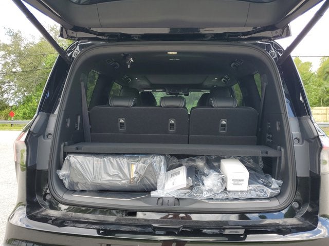 Mineral Black 2025 INFINITI QX80 AUTOGRAPH 3rd row seats: bench, 4-Wheel Disc Brakes, ABS brakes, Adaptive suspension, Air Conditioning, Alloy wheels, AM/FM radio: SiriusXM with 360L, Anti-whiplash front head restraints, Apple CarPlay/Android Auto, Audio memory, Auto High-beam Headlights, Auto tilt-away steering wheel, Auto-dimming door mirrors, Auto-dimming Rear-View mirror, Auto-leveling suspension, Automatic temperature control, Brake assist, Bumpers: body-color, Cargo Blocks, Center Front Spoiler, Climate Controlled Front Bucket Seats w/Massage, Compass, Console Net, Delay-off headlights, Driver door bin, Driver vanity mirror, Dual front impact airbags, Dual front side impact airbags, Electronic Stability Control, Emergency communication system: INFINITI InTouch, Four wheel independent suspension, Front anti-roll bar, Front Bucket Seats, Front Center Armrest, Front dual zone A/C, Front reading lights, Fully automatic headlights, Garage door transmitter: myQ Connected Garage, Genuine wood dashboard insert, Genuine wood door panel insert, Heads-Up Display, Heated door mirrors, Heated front seats, Heated rear seats, Heated steering wheel, HVAC memory, Illuminated entry, Knee airbag, Leather steering wheel, Literature Kit, Low tire pressure warning, Memory seat, Navigation system: Google Built-in, Occupant sensing airbag, Outside temperature display, Overhead airbag, Overhead console, Panic alarm, Passenger door bin, Passenger vanity mirror, Power door mirrors, Power driver seat, Power Liftgate, Power moonroof, Power passenger seat, Power steering, Power windows, Premium Cargo Package, Premium Paint, Radio data system, Radio: Klipsch Reference Premiere Audio System, Rain sensing wipers, Rear air conditioning, Rear anti-roll bar, Rear reading lights, Rear seat center armrest, Rear window defroster, Rear window wiper, Reclining 3rd row seat, Remote keyless entry, Reversible Cargo Mat, Security system, Semi-Aniline Premium Leather Seating Surfaces, Smart Luggage Shelf, Soft Sided Cooler, Speed control, Speed-sensing steering, Split folding rear seat, Spoiler, Steering wheel memory, Steering wheel mounted audio controls, Tachometer, Telescoping steering wheel, Tilt steering wheel, Traction control, Trip computer, Turn signal indicator mirrors, Variably intermittent wipers, Ventilated front seats, Ventilated rear seats, Wheels: 22 x 8 Cast Aluminum Alloy. 4WD 9-Speed Automatic 3.5L V6 DOHC 24V