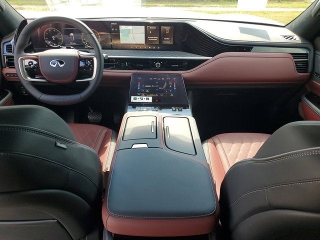 Radiant White/Black Obsidian 2026 INFINITI QX80 AUTOGRAPH 3rd row seats: bench, 4-Wheel Disc Brakes, ABS brakes, Adaptive suspension, Air Conditioning, Alloy wheels, AM/FM radio: SiriusXM with 360L, Anti-whiplash front head restraints, Apple CarPlay/Android Auto, Audio memory, Auto High-beam Headlights, Auto tilt-away steering wheel, Auto-dimming door mirrors, Auto-dimming Rear-View mirror, Auto-leveling suspension, Automatic temperature control, Black Interior Lighting Package, Brake assist, Bumpers: body-color, Cargo Blocks/Stabilizers, Cargo Shelf/Barrier, Carpeted Cargo Area Protector, Compass, Console Net, Delay-off headlights, Driver door bin, Driver vanity mirror, Dual front impact airbags, Dual front side impact airbags, Electronic Stability Control, Emergency communication system: INFINITI InTouch, Four wheel independent suspension, Front anti-roll bar, Front Bucket Seats, Front Center Armrest, Front dual zone A/C, Front reading lights, Fully automatic headlights, Garage door transmitter: myQ Connected Garage, Genuine wood dashboard insert, Genuine wood door panel insert, Heads-Up Display, Heated and Climate Controlled Front Bucket Seats with Massage, Heated door mirrors, Heated front seats, Heated rear seats, Heated steering wheel, HVAC memory, Illuminated entry, INFINITI Radiant Black Cargo Scuff Plates, Knee airbag, Leather steering wheel, Low tire pressure warning, Memory seat, Navigation system: Google Built-in, Occupant sensing airbag, Outside temperature display, Overhead airbag, Overhead console, Panic alarm, Panoramic Illuminated Headliner, Passenger door bin, Passenger vanity mirror, Power door mirrors, Power driver seat, Power Liftgate, Power moonroof, Power passenger seat, Power steering, Power windows, Premium Cargo Package, Radio data system, Radio: Klipsch Premiere Audio System, Rain sensing wipers, Rear air conditioning, Rear anti-roll bar, Rear reading lights, Rear seat center armrest, Rear window defroster, Rear window wiper, Reclining 3rd row seat, Remote keyless entry, Security system, Semi-Aniline Premium Leather Seating Surfaces, Soft-Sided Cargo Cooler, Speed control, Speed-sensing steering, Splash Guards, Split folding rear seat, Spoiler, Steering wheel memory, Steering wheel mounted audio controls, Tachometer, Telescoping steering wheel, Tilt steering wheel, Traction control, Trip computer, Turn signal indicator mirrors, Two-Tone Super Premium Paint, Variably intermittent wipers, Ventilated front seats, Ventilated rear seats, Wheels: 22 x 8.5J Cast Aluminum-Alloy. 4WD 9-Speed Automatic 3.5L V6 DOHC 24V