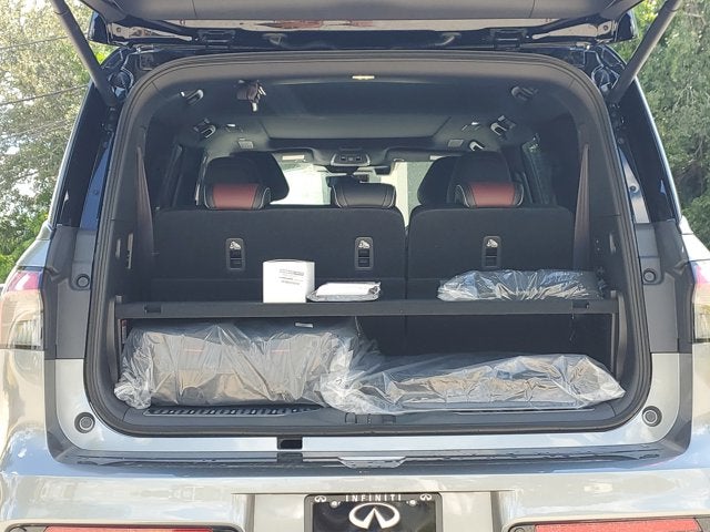 Dynamic Metal/Black Obsidian 2026 INFINITI QX80 AUTOGRAPH 3rd row seats: bench, 4-Wheel Disc Brakes, ABS brakes, Adaptive suspension, Air Conditioning, Alloy wheels, AM/FM radio: SiriusXM with 360L, Anti-whiplash front head restraints, Apple CarPlay/Android Auto, Audio memory, Auto High-beam Headlights, Auto tilt-away steering wheel, Auto-dimming door mirrors, Auto-dimming Rear-View mirror, Auto-leveling suspension, Automatic temperature control, Black Interior Lighting Package, Brake assist, Bumpers: body-color, Cargo Blocks/Stabilizers, Cargo Shelf/Barrier, Carpeted Cargo Area Protector, Compass, Console Net, Delay-off headlights, Driver door bin, Driver vanity mirror, Dual front impact airbags, Dual front side impact airbags, Electronic Stability Control, Emergency communication system: INFINITI InTouch, Four wheel independent suspension, Front anti-roll bar, Front Bucket Seats, Front Center Armrest, Front dual zone A/C, Front reading lights, Fully automatic headlights, Garage door transmitter: myQ Connected Garage, Genuine wood dashboard insert, Genuine wood door panel insert, Heads-Up Display, Heated and Climate Controlled Front Bucket Seats with Massage, Heated door mirrors, Heated front seats, Heated rear seats, Heated steering wheel, HVAC memory, Illuminated entry, INFINITI Radiant Black Cargo Scuff Plates, Knee airbag, Leather steering wheel, Low tire pressure warning, Memory seat, Navigation system: Google Built-in, Occupant sensing airbag, Outside temperature display, Overhead airbag, Overhead console, Panic alarm, Panoramic Illuminated Headliner, Passenger door bin, Passenger vanity mirror, Power door mirrors, Power driver seat, Power Liftgate, Power moonroof, Power passenger seat, Power steering, Power windows, Premium Cargo Package, Radio data system, Radio: Klipsch Premiere Audio System, Rain sensing wipers, Rear air conditioning, Rear anti-roll bar, Rear reading lights, Rear seat center armrest, Rear window defroster, Rear window wiper, Reclining 3rd row seat, Remote keyless entry, Security system, Semi-Aniline Premium Leather Seating Surfaces, Soft-Sided Cargo Cooler, Speed control, Speed-sensing steering, Splash Guards, Split folding rear seat, Spoiler, Steering wheel memory, Steering wheel mounted audio controls, Tachometer, Telescoping steering wheel, Tilt steering wheel, Traction control, Trip computer, Turn signal indicator mirrors, Two-Tone Premium Paint, Variably intermittent wipers, Ventilated front seats, Ventilated rear seats, Wheels: 22 x 8.5J Cast Aluminum-Alloy. 4WD 9-Speed Automatic 3.5L V6 DOHC 24V