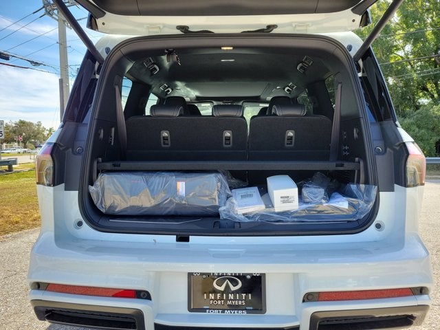 Radiant White 2026 INFINITI QX80 AUTOGRAPH 3rd row seats: bench, 4-Wheel Disc Brakes, ABS brakes, Adaptive suspension, Air Conditioning, Alloy wheels, AM/FM radio: SiriusXM with 360L, Anti-whiplash front head restraints, Apple CarPlay/Android Auto, Audio memory, Auto High-beam Headlights, Auto tilt-away steering wheel, Auto-dimming door mirrors, Auto-dimming Rear-View mirror, Auto-leveling suspension, Automatic temperature control, Brake assist, Bumpers: body-color, Cargo Blocks/Stabilizers, Cargo Shelf/Barrier, Carpeted Cargo Area Protector, Compass, Console Net, Delay-off headlights, Driver door bin, Driver vanity mirror, Dual front impact airbags, Dual front side impact airbags, Electronic Stability Control, Emergency communication system: INFINITI InTouch, Four wheel independent suspension, Front anti-roll bar, Front Bucket Seats, Front Center Armrest, Front dual zone A/C, Front reading lights, Fully automatic headlights, Garage door transmitter: myQ Connected Garage, Genuine wood dashboard insert, Genuine wood door panel insert, Heads-Up Display, Heated and Climate Controlled Front Bucket Seats with Massage, Heated door mirrors, Heated front seats, Heated rear seats, Heated steering wheel, HVAC memory, Illuminated entry, Knee airbag, Leather steering wheel, Low tire pressure warning, Memory seat, Navigation system: Google Built-in, Occupant sensing airbag, Outside temperature display, Overhead airbag, Overhead console, Panic alarm, Passenger door bin, Passenger vanity mirror, Power door mirrors, Power driver seat, Power Liftgate, Power moonroof, Power passenger seat, Power steering, Power windows, Premium Cargo Package, Radio data system, Radio: Klipsch Premiere Audio System, Rain sensing wipers, Rear air conditioning, Rear anti-roll bar, Rear reading lights, Rear seat center armrest, Rear window defroster, Rear window wiper, Reclining 3rd row seat, Remote keyless entry, Security system, Semi-Aniline Premium Leather Seating Surfaces, Soft-Sided Cargo Cooler, Speed control, Speed-sensing steering, Splash Guards, Split folding rear seat, Spoiler, Steering wheel memory, Steering wheel mounted audio controls, Super Premium Paint, Tachometer, Telescoping steering wheel, Tilt steering wheel, Traction control, Trip computer, Turn signal indicator mirrors, Variably intermittent wipers, Ventilated front seats, Ventilated rear seats, Wheels: 22 x 8.5J Cast Aluminum-Alloy. 4WD 9-Speed Automatic 3.5L V6 DOHC 24V